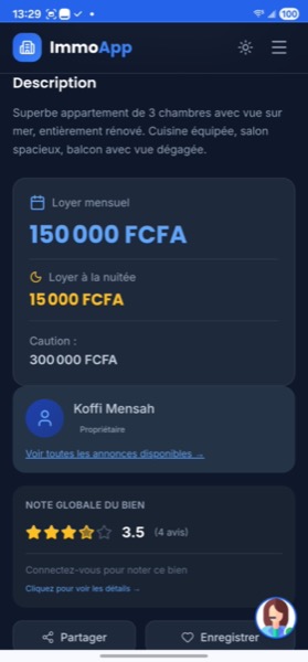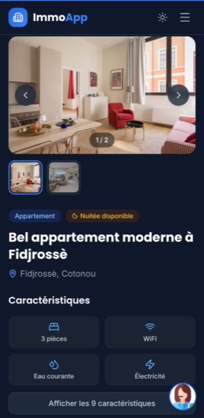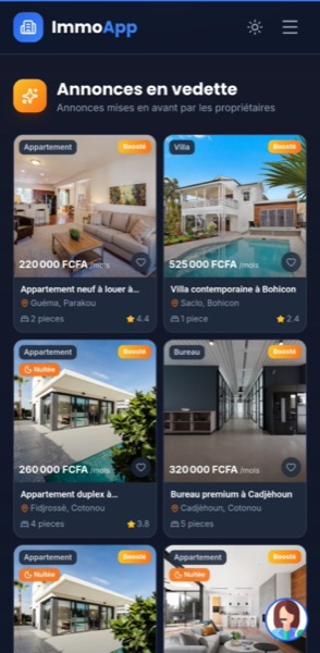 Une interface intuitive, pensée pour le marché béninois. Parcourez les annonces, consultez les détails et contactez les propriétaires en quelques clics.